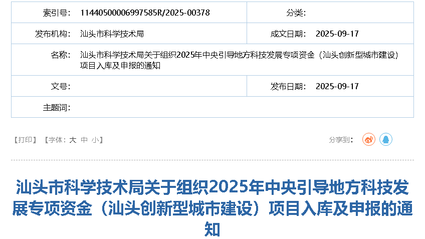 关于组织2025年中央引地方科技发展专项资金(汕头创新型城市建设项目)入库及申报的通知