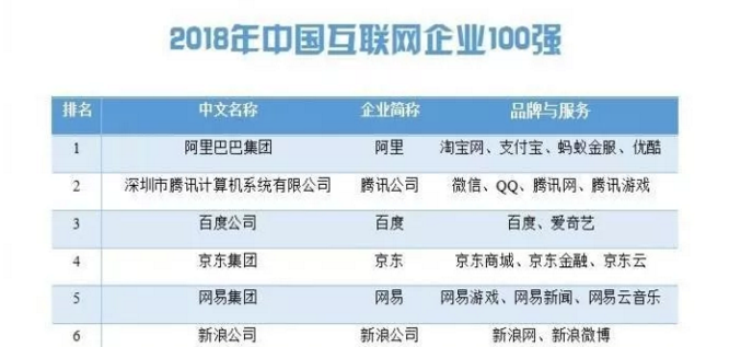 2018年中国互联网企业百强榜单揭晓
