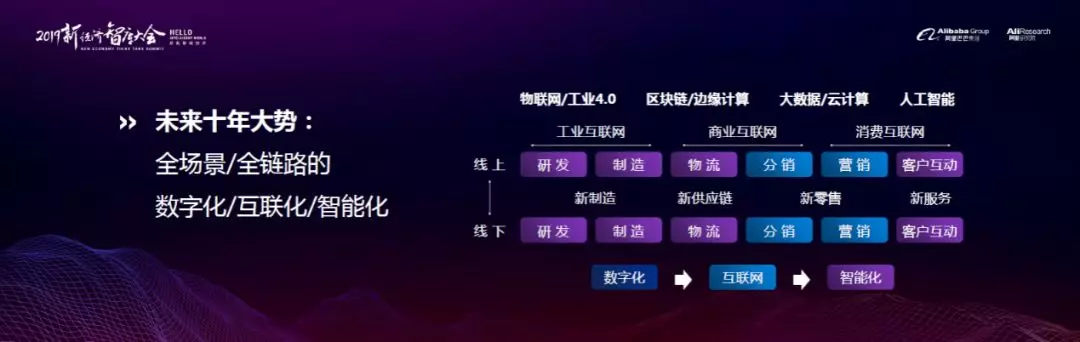 我们现在看到的数字化、互联化,大多数产生在信息的传递或者是商品的交易上,也就是所谓的消费端互联网的概念。我们看到新零售的雏形,线上代表是数据,线下是物理世界,二者产生了交织。目前,越来越多的组织设立一个新零售部门,统合线上线下的销售。这样的模式,在未来的十年应该也会继续发展到全产业链路的其他部分,比如说供应链方面,物理世界的车货仓和线上世界融合;制造方面,线下生产线跟线上数据分析融合。未来,也许会看到一个全链路的数字化跟互联化的协同,可使现在很多看似没有成功的商业模式能够创造更大的价值。