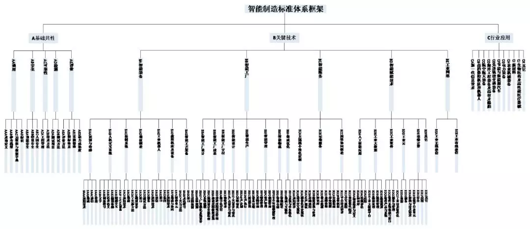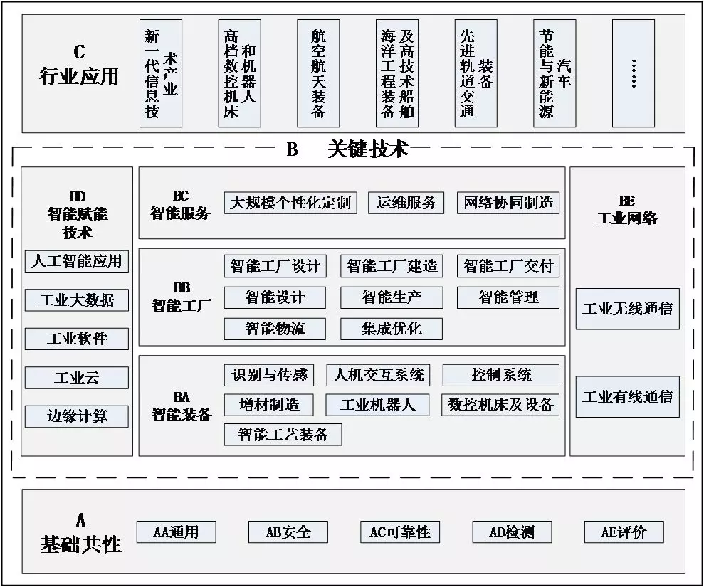 智能制造标准体系框架由智能制造标准体系结构向下映射而成,是形成智能制造标准体系的基本组成单元。智能制造标准体系框架包括“A基础共性”、“B关键技术”、“C行业应用”三个部分,如图3所示。