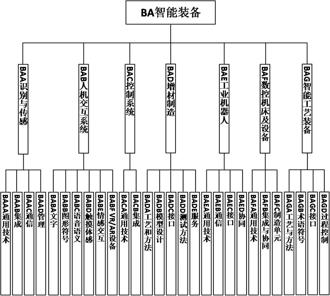 具体而言,A基础共性标准包括通用、安全、可靠性、检测、评价等五大类,位于智能制造标准体系结构图的最底层,是B关键技术标准和C行业应用标准的支撑。B关键技术标准是智能制造系统架构智能特征维度在生命周期维度和系统层级维度所组成的制造平面的投影,其中BA智能装备对应智能特征维度的资源要素,BB智能工厂对应智能特征维度的资源要素和系统集成,BC智能服务对应智能特征维度的新兴业态,BD智能赋能技术对应智能特征维度的融合共享,BE工业网络对应智能特征维度的互联互通。C行业应用标准位于智能制造标准体系结构图的最顶层,面向行业具体需求,对A基础共性标准和B关键技术标准进行细化和落地,指导各行业推进智能制造。