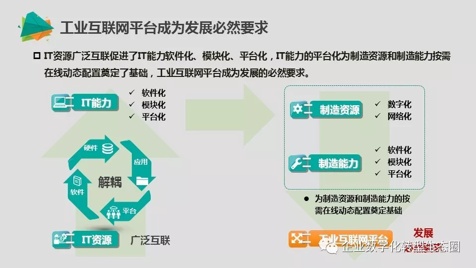 IT资源广泛互联促进了IT能力软件化、模块化、平台化,IT能力的平台化为制造资源和制造能力按需在线动态配置奠定了基础,工业互联网平台成为发展的必然要求。
