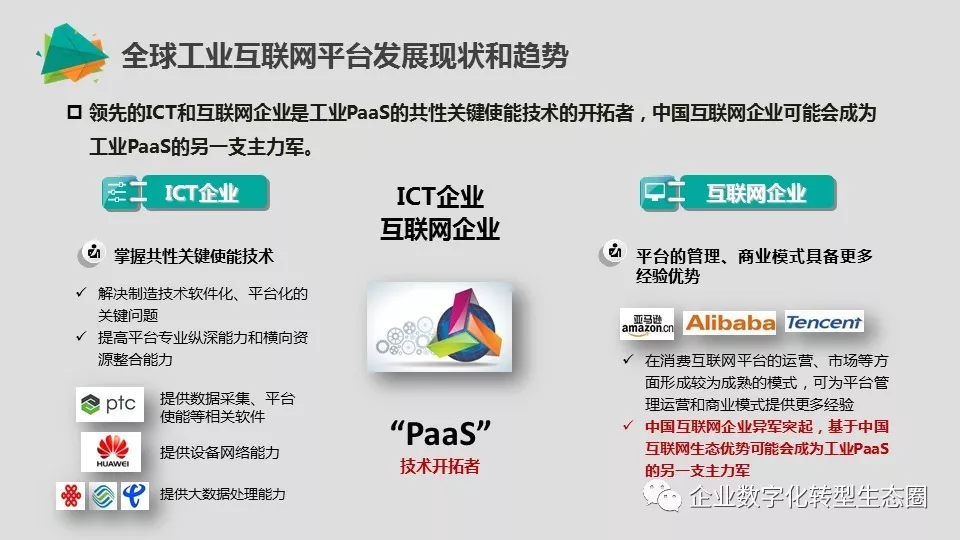 领先的ICT和互联网企业是工业PaaS的共性关键使能技术的开拓者,中国互联网企业可能会成为工业PaaS的另一支主力军;