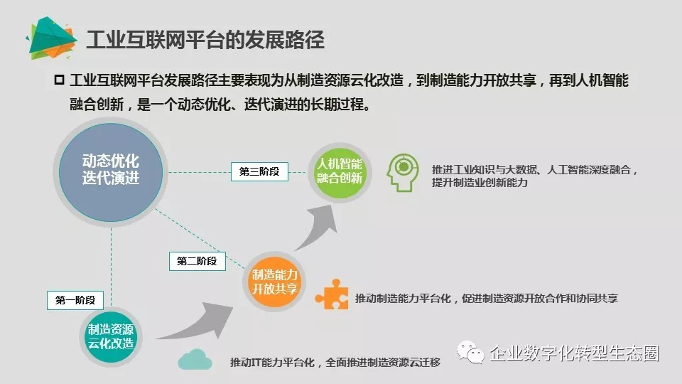 工业互联网平台发展路径主要表现为从制造资源云化改造,到制造能力开放共享,再到人机智能融合创新,是一个动态优化、迭代演进的长期过程: