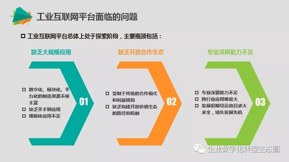 工业互联网平台总体上处于探索阶段,主要瓶颈包括:缺乏大规模应用、缺乏开放合作生态、专业深耕能力不足。