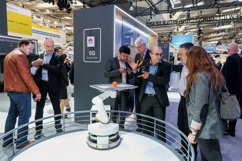 制造业强,企业必须强。图为2018年4月24日,在德国汉诺威工业博览会上,参观者在华为公司展区观看运用第五代移动通信技术(5G)操控的机器人。该机器人利用5G技术的协助保证操控的稳定和精确,使方形盘子上的小球不会滚落。 新华社记者 单宇琦/摄