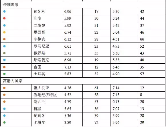 高潜力国家:目前制造业基础有限,在制造业驱动因素方面得分较高,表明其存在制造业发展潜力,但取决于国民经济优先发展次序。(7个,如澳大利亚、挪威、新西兰等)