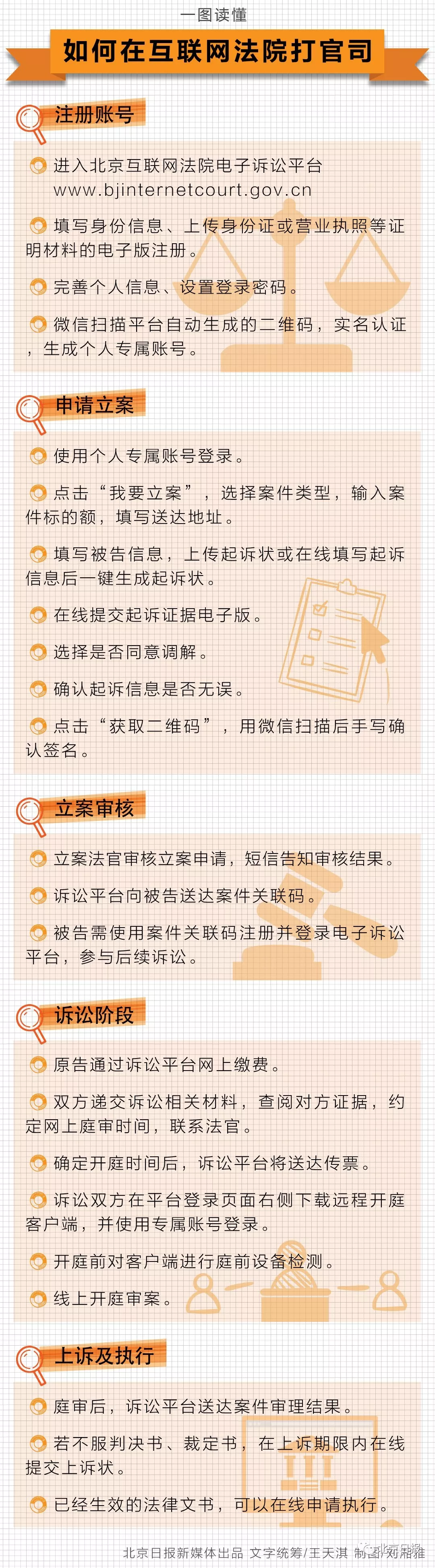 今后,在北京互联网法院打官司,将实现“网上案件网上审”。一起案件的起诉、调解、立案、送达、庭审等诉讼环节都能通过北京互联网法院电子诉讼平台全程网上办理,实现便民诉讼,节约司法资源。