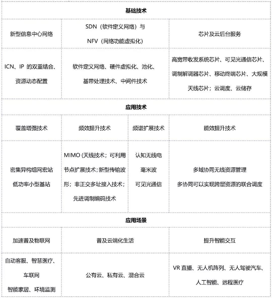 和4G相比,5G的提升是全方位的,按照3GPP的定义,5G既包括大规模天线,超密集组网,新型多址技术、全频谱接入及新型网络架构等关键应用技术,也包括新型信息中心网络、软件定义网络、虚拟化、云存储等基础支撑技术。总的来说,5G的技术体系分为基础技术和应用技术两个层面。