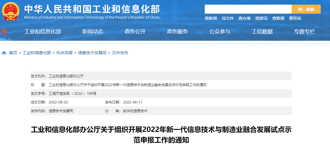 2022年新一代信息技术与制造业融合发展试点示范申报工作启动