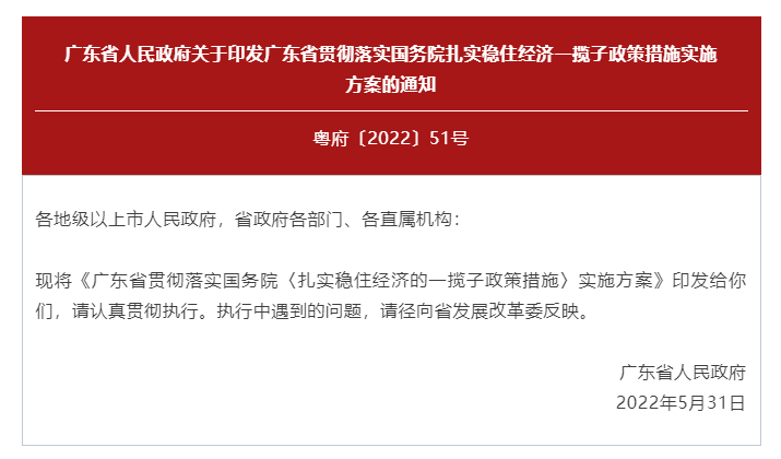 速递 | 广东省人民政府关于印发广东省贯彻落实国务院扎实稳住经济一揽子政策措施实施方案的通知