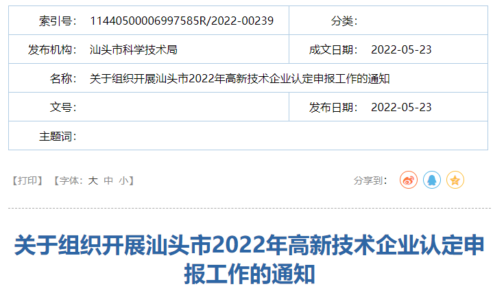 关于组织开展汕头市2022年高新技术企业认定申报工作的通知