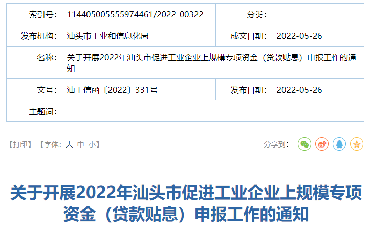 关于开展2022年汕头市促进工业企业上规模专项资金(贷款贴息)申报工作的通知