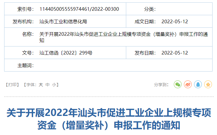 关于开展2022年汕头市促进工业企业上规模专项资金(增量奖补)申报工作的通知