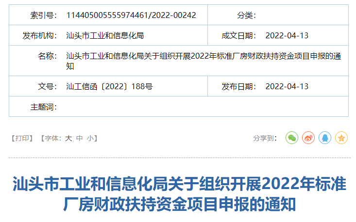 汕头市工业和信息化局关于组织开展2022年标准厂房财政扶持资金项目申报的通知