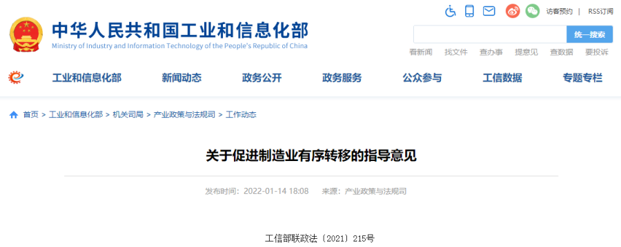 工信部等十部门联合发布《关于促进制造业有序转移的指导意见》