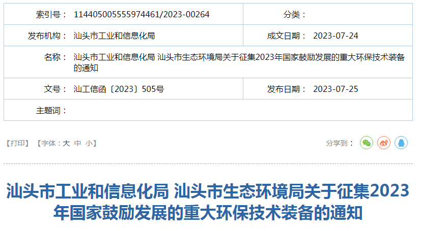 汕头市工业和信息化局 汕头市生态环境局关于征集2023年国家鼓励发展的重大环保技术装备的通知