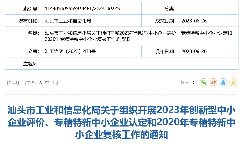 汕头市工业和信息化局关于组织开展2023年创新型中小企业评价、专精特新中小企业认定和2020年专精特新中小企业复核工作的通知