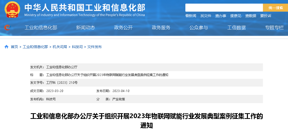 工信部组织开展2023年物联网赋能行业发展典型案例征集工作