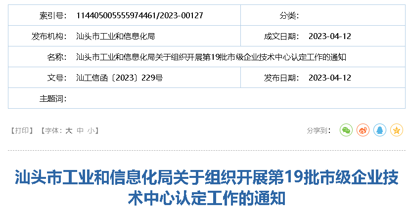 汕头市工业和信息化局关于组织开展第19批市级企业技术中心认定工作的通知