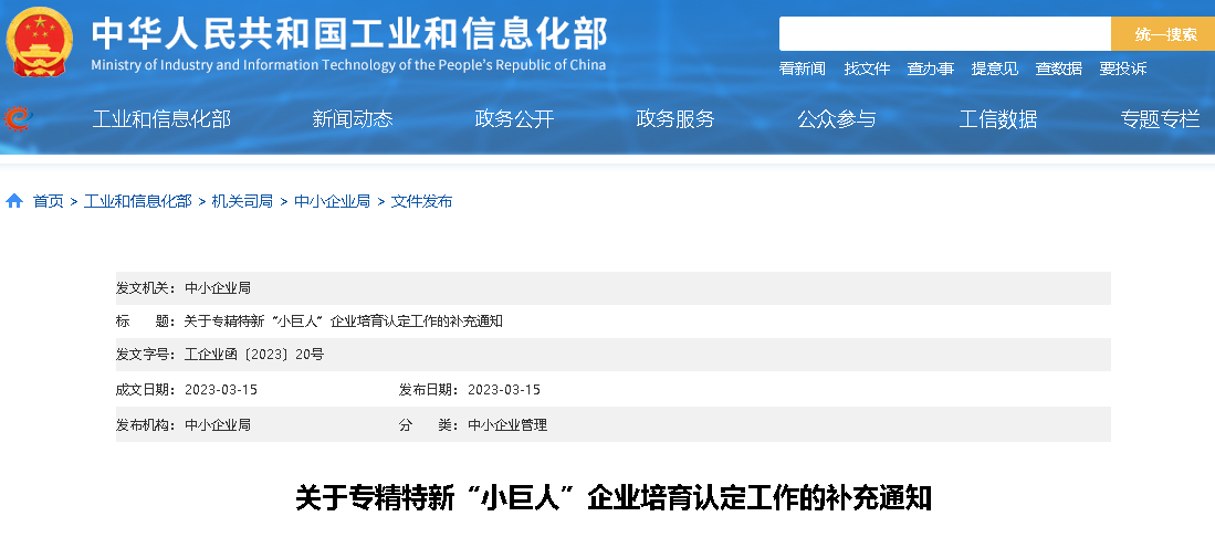关于专精特新“小巨人”企业培育认定工作的补充通知