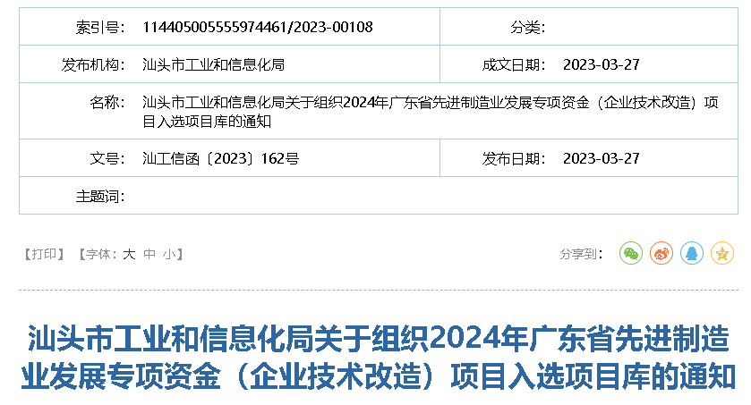 汕头市工业和信息化局关于组织2024年广东省先进制造业发展专项资金(企业技术改造)项目入选项目库的通知