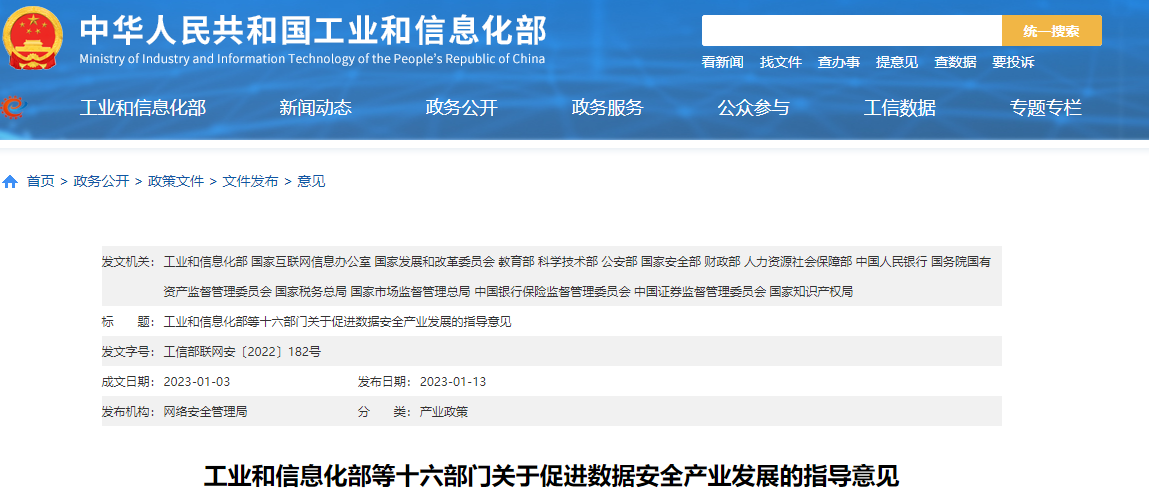 工信部等十六部门联合印发《关于促进数据安全产业发展的指导意见》