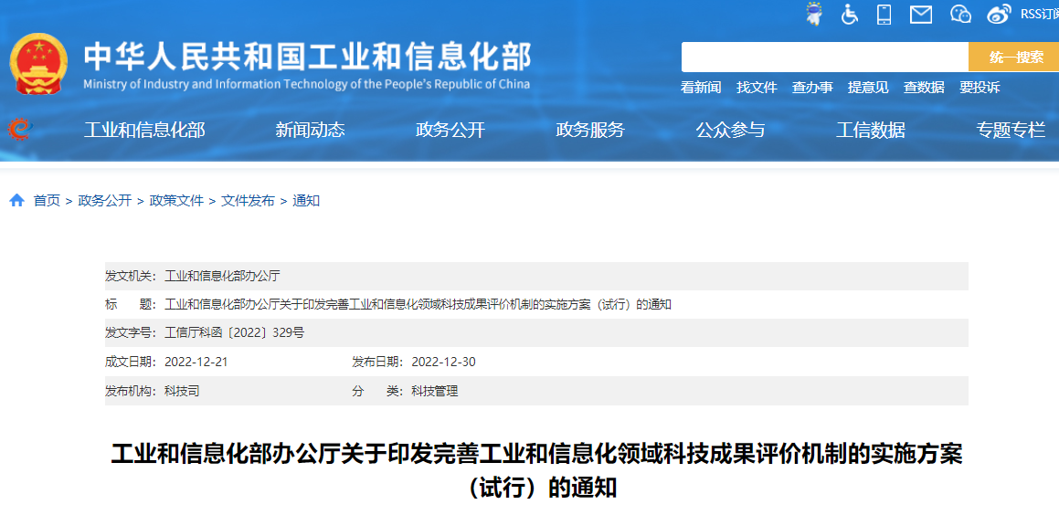工信部印发《关于完善工业和信息化领域科技成果评价机制的实施方案(试行)》