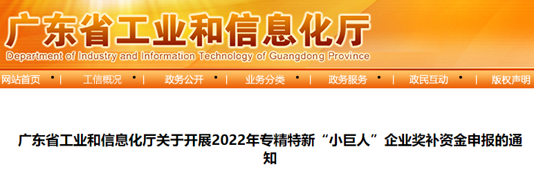 广东省工业和信息化厅关于开展2022年专精特新“小巨人”企业奖补资金申报的通知