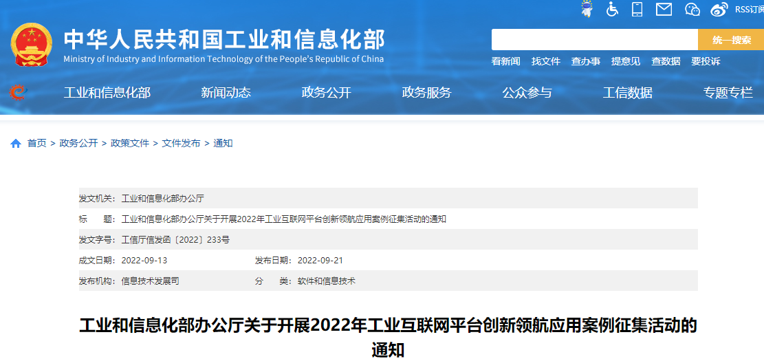 工信部组织开展2022年工业互联网平台创新领航应用案例征集活动