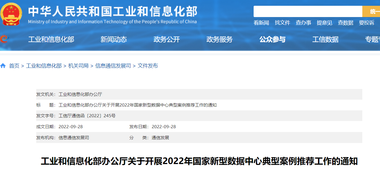 工业和信息化部办公厅关于开展2022年国家新型数据中心典型案例推荐工作的通知