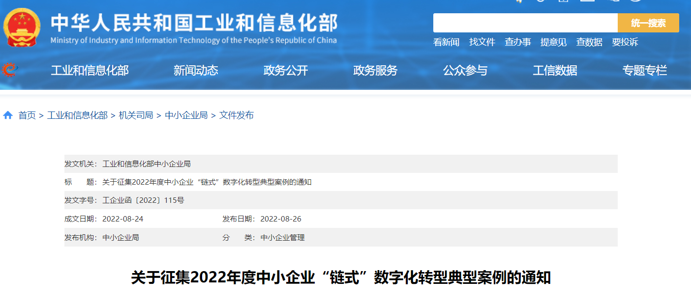 工信部组织开展2022年度中小企业“链式”数字化转型典型案例征集工作